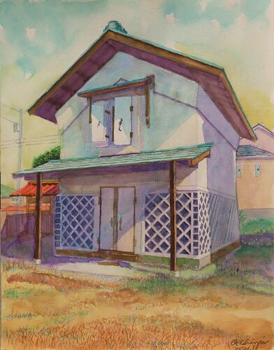 【絵筆散策西東京・蔵(5)……泉町1丁目保谷家の蔵、水彩画、F6(410×318mm)、2021年】 この蔵は、2015年に今回描いた反対側から描いたことがありますが、そのときは木戸と蔵の組み合わせに魅せられて描きました。今回は、正面から見たときのなまこ壁の見事…